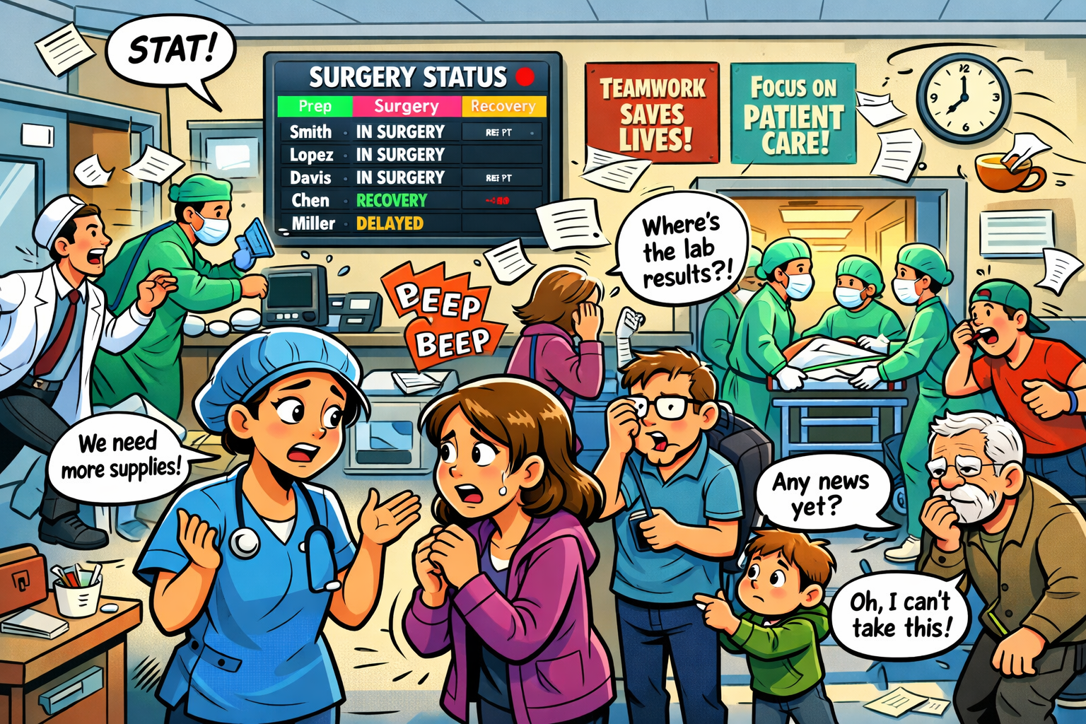 - A family member leaves the waiting room and stops a nurse to ask what’s happening.
